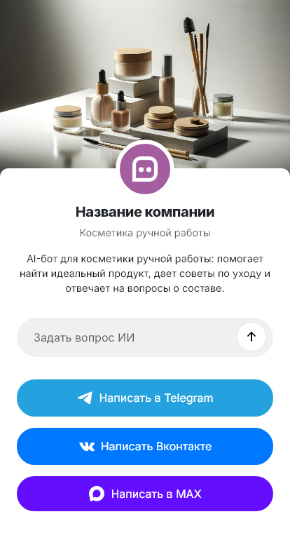В итоге ручная косметика продаётся стабильнее, потому что клиент быстро получает понятный подбор и удобное оформление. Бот работает в Telegram, VK, MAX и на сайте, превращая вопросы о составе в покупки и лояльность.