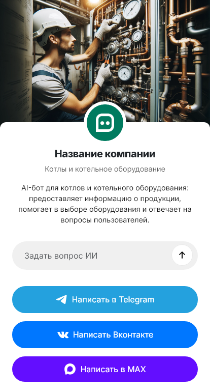В итоге котлы и котельное оборудование подбираются и внедряются быстрее. Бот работает в Telegram, VK, MAX и на сайте, помогает не терять заявки, ускоряет расчёты и повышает качество коммуникации от первого обращения до запуска котельной.