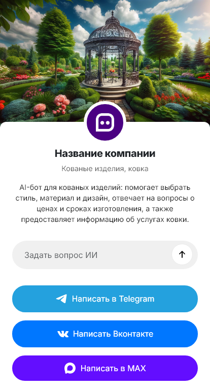 В итоге кованые изделия продаются и производятся более эффективно. Бот работает в Telegram, VK, MAX и на сайте, помогает собрать точные вводные, ускоряет расчёт и согласование дизайна и доводит клиента от идеи до монтажа без потери заявок.