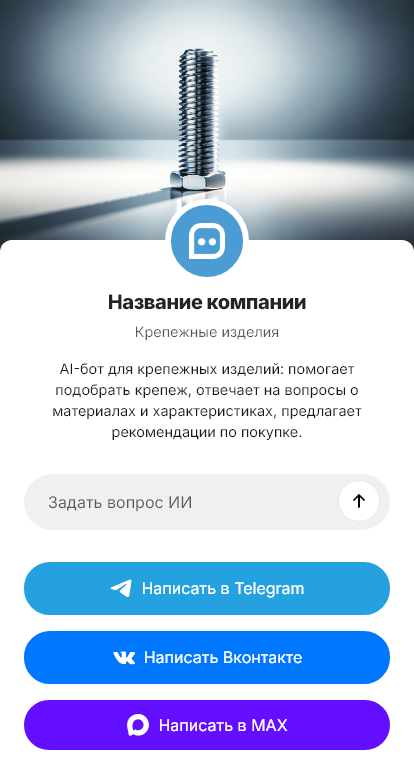Бот помогает быстро сформировать правильный заказ. Он уточняет, что крепим и к чему, бетон, кирпич, газобетон, металл, дерево, какие нагрузки и условия, улица или помещение, влажность, коррозия. Он подбирает тип крепежа, рекомендует длину и диаметр и помогает рассчитать количество с учетом запаса. Клиент может прикрепить ведомость или смету, а бот выделит позиции и сформирует заявку на счет, чтобы менеджер не тратил время на расшифровку.