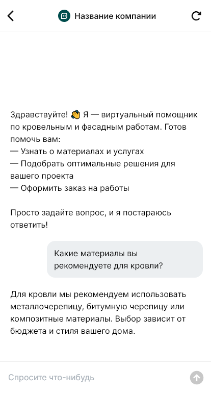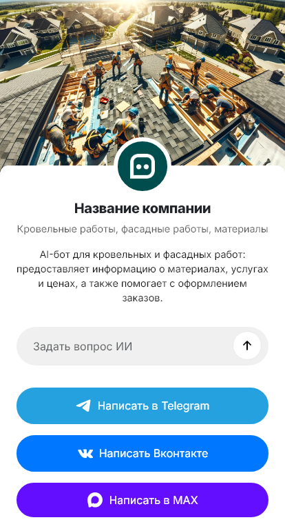 В итоге комплекс кровля плюс фасад выполняется спокойнее и быстрее. Бот работает в Telegram, VK, MAX и на сайте, помогает собрать вводные, выстроить этапность, ускорить расчёт и довести заказчика от запроса до согласованного проекта и выполнения работ без потери заявок.