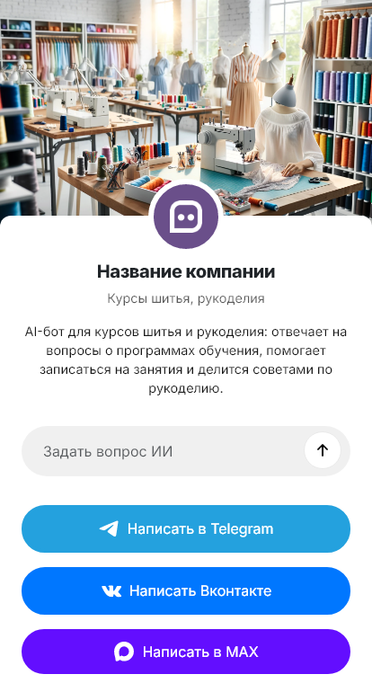 Бот для курсов шитья помогает подобрать подходящее направление и записать на занятие. Он уточняет уровень (новичок/есть опыт), цель обучения, интересующие изделия, формат занятий (группа/индивидуально), удобные дни и время, наличие швейной машины дома, а также бюджет и контактные данные. Бот может рассказать, что входит в курс, какие материалы понадобятся, и предложить пробный урок.