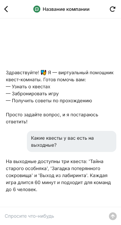 Квест-комнаты выбирают под конкретный повод: вечер с друзьями, день рождения, корпоратив, семейный отдых. Клиенты хотят быстро понять, какой квест подходит по уровню сложности, возрасту и количеству участников, есть ли свободные слоты и что входит в стоимость. При этом на первом контакте часто много вопросов: страшно ли, сколько длится, можно ли подросткам, есть ли сопровождение, как добраться. Если ответы приходят медленно, люди бронируют у конкурентов.