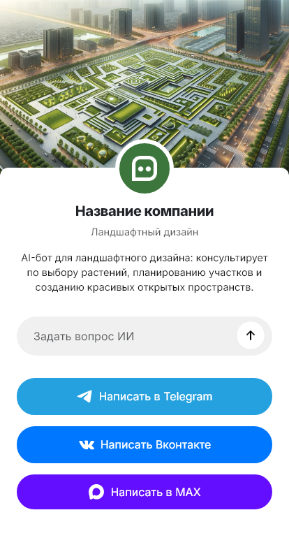 Чат-бот уточняет базовые параметры (площадь участка, расположение, задачи — газон, дорожки, освещение, автополив), показывает примеры работ и ориентиры по стоимости, предлагает удобное время для консультации или выезда на замер. Решение работает в Telegram, ВК, MAX и на сайте — клиент получает быстрый ответ в любое время, а контакты и детали запроса фиксируются и передаются менеджеру или в CRM.