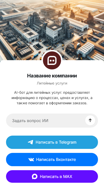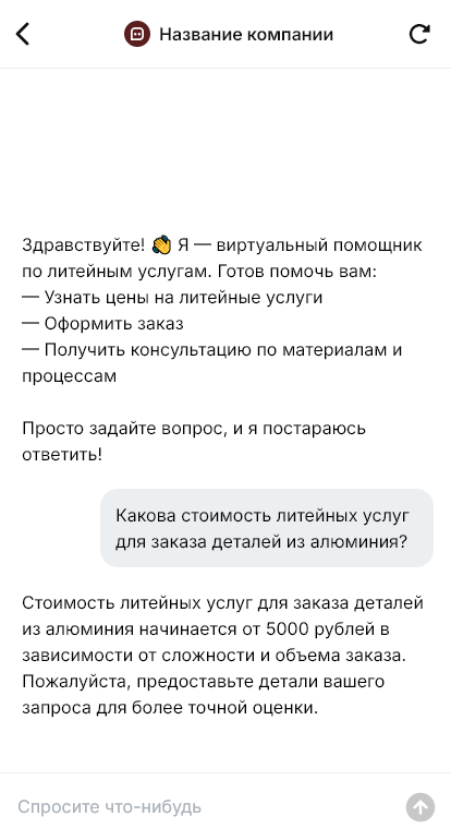 Внедрение настраивается под ваш производственный цикл: расчёт оснастки, изготовление формы, пробная отливка, серийное производство, контроль качества, отгрузка. Бот интегрируется с CRM и помогает вести статус заказа, собирать реквизиты, согласовывать образец и условия оплаты. Для постоянных клиентов бот упрощает повторные заказы и хранит типовые параметры по изделиям.