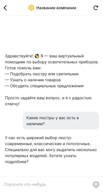 Внедрение настраивается под ваш каталог: характеристики, совместимые лампы, наличие, аналоги, доставка, установка, интеграция с CRM и оплатой. Бот может собирать фото комнаты и места установки, чтобы консультант дал более точную рекомендацию.