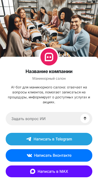 Чат-бот отвечает на типовые вопросы, показывает прайс и услуги, уточняет пожелания (длина, дизайн, снятие), предлагает свободные слоты, фиксирует контакт и отправляет заявку администратору или в CRM. Решение работает в Telegram, VK, MAX и на сайте, поэтому клиент получает быстрый ответ в любом канале.