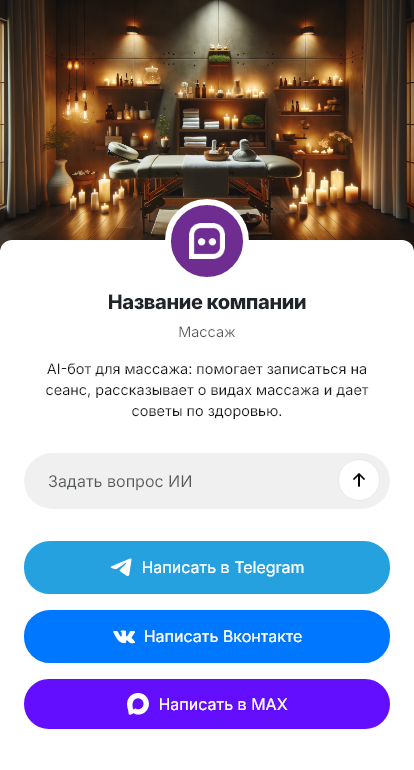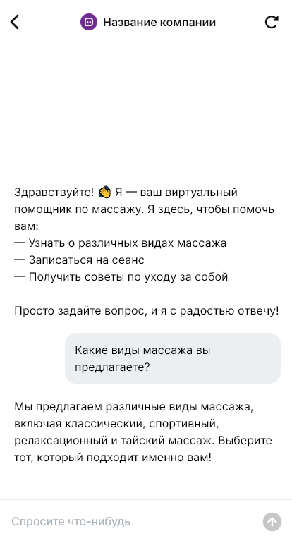 Внедрение настраивается под студию или частного специалиста: виды массажа, длительность и стоимость, правила подготовки, рекомендации после сеанса, условия отмены, интеграция с календарём и CRM. Бот подтверждает запись, напоминает о визите, помогает переносить время без звонков и поддерживает клиента в курсовом режиме — предлагая следующий сеанс в подходящий интервал.