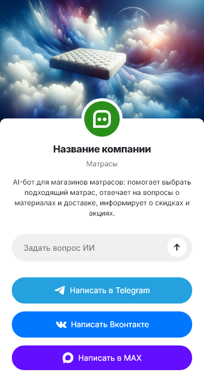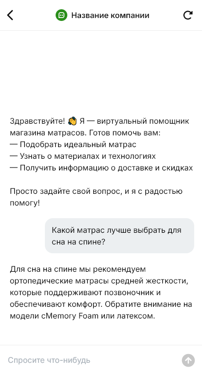 Покупка матраса — это выбор здоровья и комфорта, поэтому вопросов много: жёсткость, нагрузка на спальное место, рост и вес, особенности позвоночника, эффект памяти, независимые пружины, высота, материалы, запах, срок службы, доставка и возможность возврата. Клиенту сложно ориентироваться в терминах, и без грамотной консультации он либо откладывает покупку, либо выбирает случайно. При медленных ответах из мессенджера диалог обрывается.