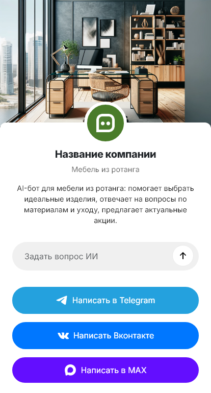 Бот для мебели из ротанга помогает быстро собрать запрос и предложить подходящий комплект. Он уточняет место использования, желаемую компоновку (диван, кресла, стол, шезлонги, подвесное кресло), количество посадочных мест, предпочтения по цвету плетения и подушек, бюджет и сроки. Бот может объяснить разницу между натуральным и искусственным ротангом, подсказать, какие модели лучше для открытого воздуха, а какие — для закрытых помещений, и как ухаживать за комплектом.