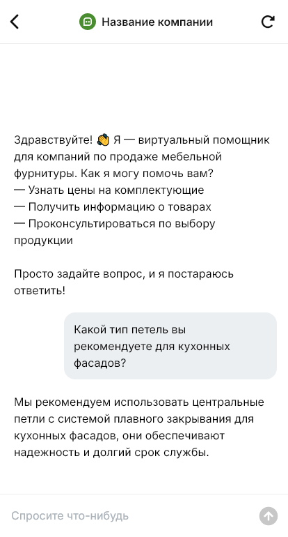 Фурнитуру и комплектующие часто ищут срочно: петли, направляющие, ручки, крепёж, подъёмные механизмы. Клиенты спрашивают совместимость, размеры, аналоги, наличие и сроки поставки. Если отвечать долго, заказ уходит к конкурентам. Бот для мебельной фурнитуры помогает автоматизировать первичную консультацию и сбор заявки.