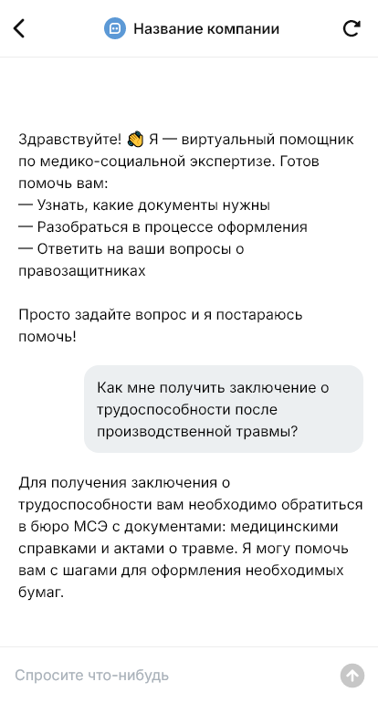 Медико‑социальная экспертиза получает обращения по сложным вопросам: порядок прохождения, необходимые документы, сроки рассмотрения, запись, получение результатов и справок. Из‑за высокой нагрузки сотрудники не всегда могут быстро отвечать в мессенджерах и на сайте. Бот для МСЭ помогает автоматизировать первичные консультации и направлять заявителя по понятному алгоритму.