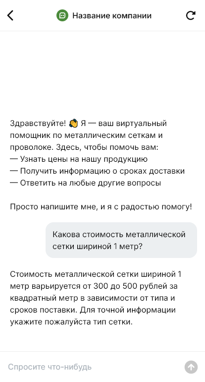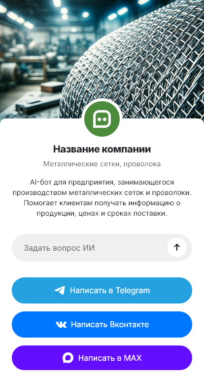 Металлические сетки и проволока — товар, где покупателю важна точность: размер ячейки, диаметр, материал, покрытие, формат поставки, наличие и доставка. При этом запросы часто идут от строителей, производств и снабженцев, которые параллельно пишут нескольким поставщикам. Если ответ не быстрый и не конкретный, заказ уходит конкурентам. Бот для металлических сеток и проволоки помогает оперативно квалифицировать запрос и собрать данные для счёта.