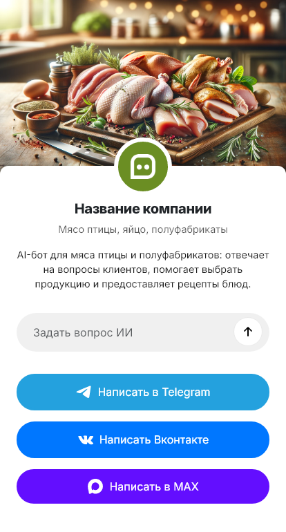 В итоге птица и полуфабрикаты продаются стабильнее, потому что сервис становится быстрым и предсказуемым. Бот работает в Telegram, VK, MAX и на сайте, превращая вопросы о наличии в оформленные заказы.