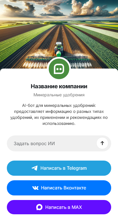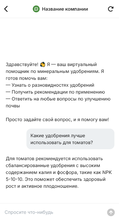 Внедрение настраивается под ваш ассортимент: составы, формы (гранулы, растворы), инструкции, наличие, доставка и оплата, интеграция с CRM. Бот может сохранять параметры участка, чтобы рекомендации становились точнее, а повторные покупки — быстрее.