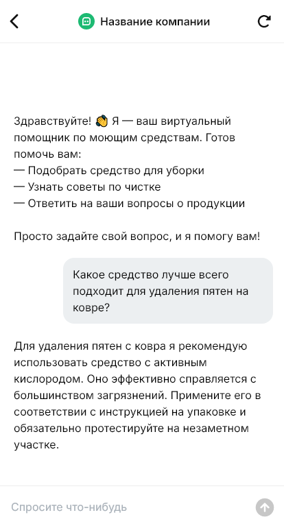 Чат-бот задаёт простые вопросы: где нужно убрать, какая поверхность, что за загрязнение и насколько срочно. Далее бот предлагает несколько вариантов по бюджету и формату (спрей, гель, концентрат), объясняет кратко правила применения и меры предосторожности, предлагает сопутствующие товары (губки, перчатки, салфетки). Для тех, кто покупает «впрок», бот может собрать комплект «на дом» или «на офис» с оптимальным набором средств.