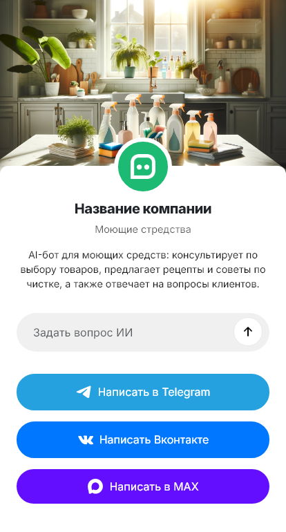 Бот работает в Telegram, ВК, MAX и на сайте 24/7, повышая конверсию обращений по моющим средствам в реальные покупки.