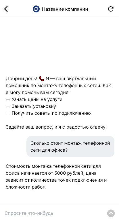 Внедрение настраивается под подрядчика: типовые пакеты, зоны выезда, правила обследования, интеграция с CRM и планированием бригад. Бот помогает объяснить этапы работ: обследование → смета → монтаж → тестирование → сдача.
