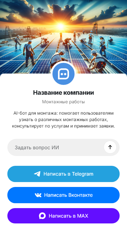 Бот работает в Telegram, ВК, MAX и на сайте 24/7, повышая скорость реакции и конверсию входящих обращений в реальные монтажные проекты.