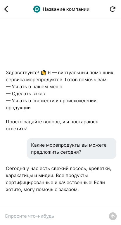 Для продавца морепродуктов бот снижает нагрузку на менеджеров и помогает управлять ассортиментом. Он отвечает на типовые вопросы о поступлениях, правилах разморозки и хранении, принимает заявки на опт для ресторанов и кейтеринга, собирая вводные по регулярности и партии. При сложных запросах бот переводит диалог сотруднику уже с выбранными параметрами, чтобы ускорить продажу и избежать ошибок в заказе.