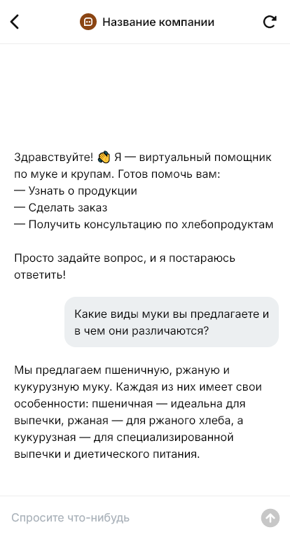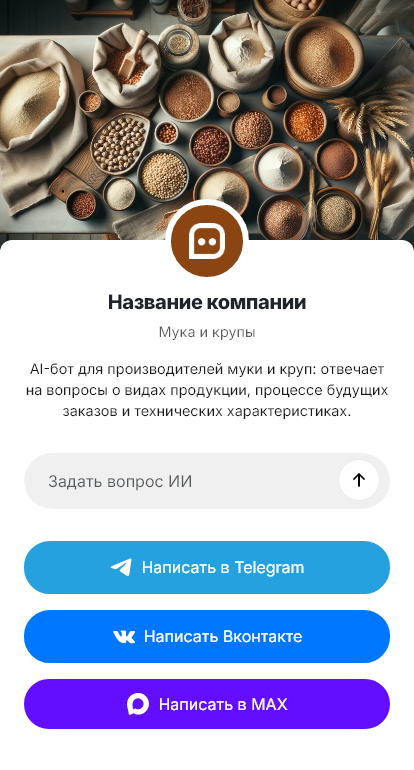 Бот помогает превратить обращение в структурированную заявку. Он уточняет тип продукции, мука, крупа, смесь, сорт и характеристики, фасовку, мешки или биг бэги, нужный объем, график отгрузок и условия приемки. Бот принимает спецификации и реквизиты, формирует запрос на счет и заранее собирает требования к документам, декларации, протоколы, ветеринарные и качественные документы там, где они нужны. Для клиентов с повторяющимися закупками бот запоминает согласованные параметры и помогает повторить заказ в пару сообщений без долгих уточнений.
