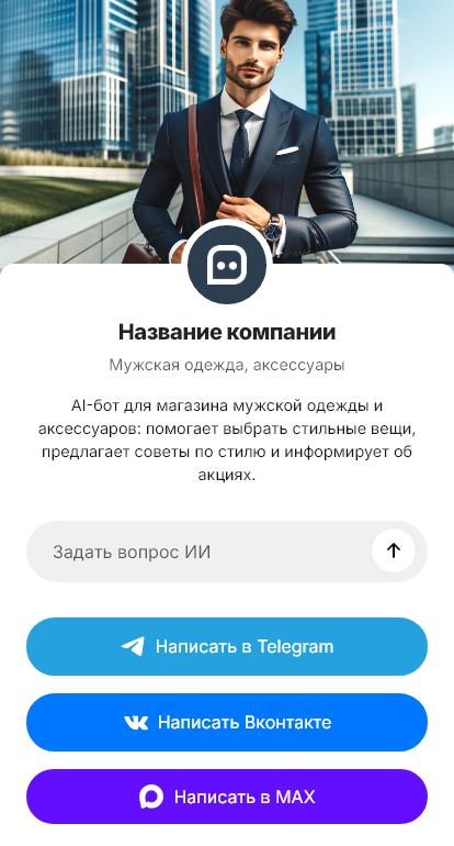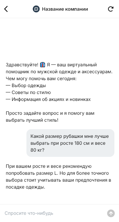 Бот для мужской одежды и аксессуаров превращает запрос в понятный сценарий выбора. Он помогает определить нужную категорию — костюмы, рубашки, трикотаж, верхняя одежда, обувь, ремни, сумки — задаёт несколько точных вопросов о росте, размере, стиле и случае (работа, повседнев, мероприятие). Затем предлагает релевантные варианты, подсказывает, как выбрать размер по параметрам и объясняет особенности моделей, чтобы человеку было проще принять решение.