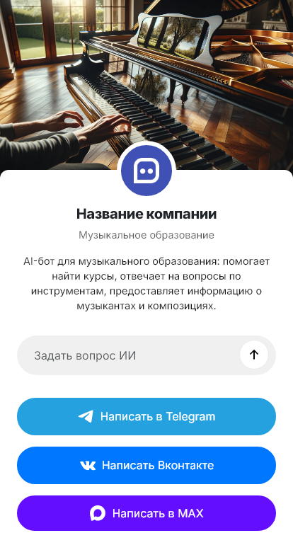 Чат-бот отвечает на типовые вопросы, помогает выбрать инструмент и программу, уточняет уровень подготовки, предлагает расписание и свободные слоты, собирает контакты и передаёт заявку администратору. Решение работает в Telegram, VK, MAX и на сайте, обеспечивая быстрый ответ 24/7.