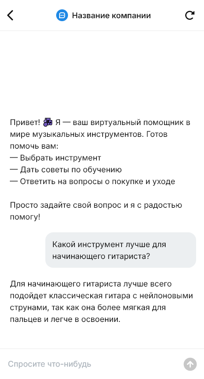 Внедрение настраивается под ассортимент и сервис: наличие, акции, гарантия, доставка, настройка и подготовка инструмента, обмен, возможность рассрочки, интеграция с CRM. Бот может вести новичка дальше — подсказывать базовые советы по уходу и предлагать обучение или подбор преподавателя, если это часть экосистемы магазина.