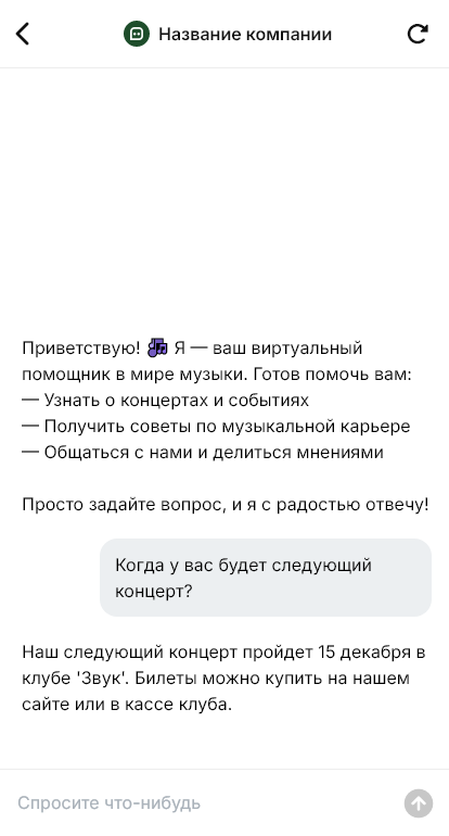 Внедрение настраивается под работу артиста: календарь занятости, условия предоплаты, правила переносов, технический райдер, логистика выезда, интеграция с CRM. Бот фиксирует договорённости и помогает подтвердить бронь, чтобы в день мероприятия не возникало путаницы по времени и оборудованию.