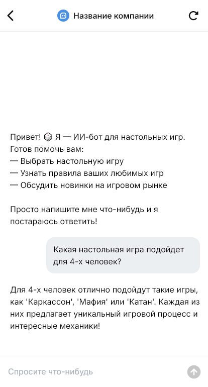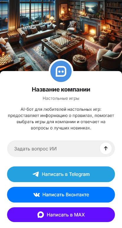 Бот работает в Telegram, ВК, MAX и на сайте 24/7, повышая конверсию обращений по настольным играм в реальные покупки.