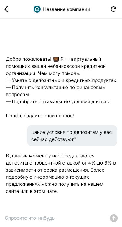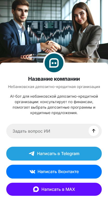 Небанковские депозитно‑кредитные организации получают обращения по продуктам, условиям, документам и подключению. Если клиент не получает быстрый ответ, он уходит к конкурентам. Бот для НДКО помогает автоматизировать первичный контакт и фиксировать заявки.