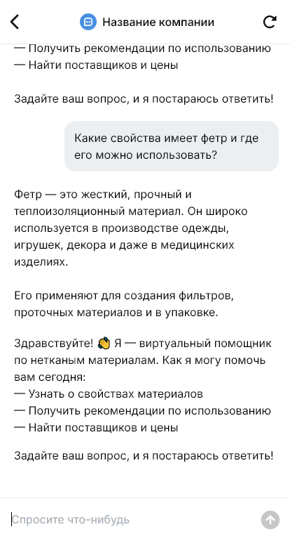В итоге нетканые материалы продаются быстрее и точнее, снижается риск неправильного подбора, а поставщик получает более предсказуемый процесс заказов и повторных закупок благодаря боту.