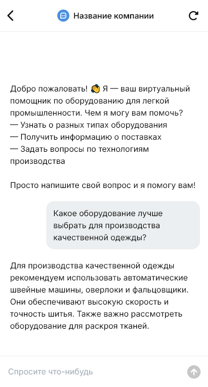 В итоге оборудование подбирается точнее, внедрение проходит быстрее, а заказчик получает понятный процесс и поддержку через бота, что снижает риск неудачной покупки и повышает эффективность производства.