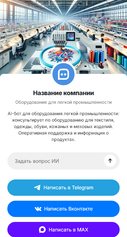 Бот помогает быстро собрать техзадание. Он уточняет тип продукции, объем выпуска, материалы, толщины, требуемые операции, раскрой, стачивание, оверлок, вышивка, термоперенос, и условия в цехе, питание, площадь, вентиляция. Он помогает сформировать несколько вариантов комплектации, базовый для старта, производственный для стабильной загрузки, или автоматизированный для роста. Бот может собрать ориентировочные данные для расчета окупаемости, стоимость смены, количество операторов, экономия времени, чтобы заказчик мог сравнить варианты не только по цене, но и по эффективности.