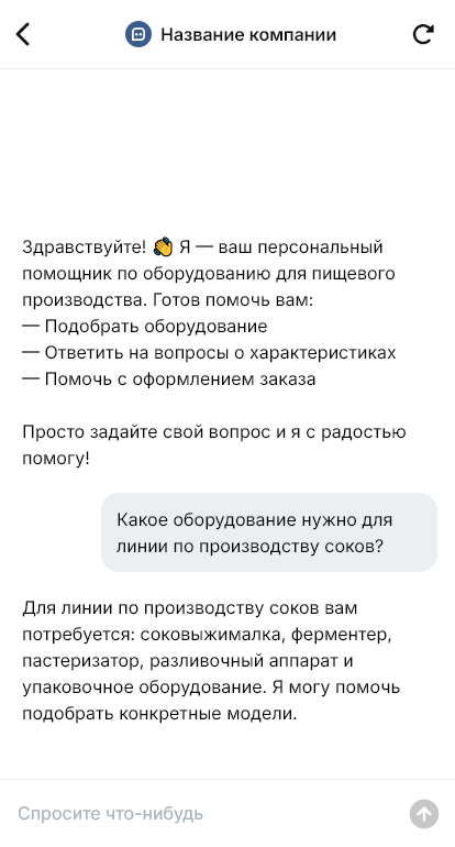 Внедрение настраивается под вашу компанию: каталог оборудования, опции, сервис и монтаж, интеграция с CRM, статусы согласования, планирование выездов. Бот может назначать обследование цеха, фиксировать этапы: сбор требований → подбор → КП → поставка → монтаж → пусконаладка → обучение → сервис, и помогать собирать документы для договора.