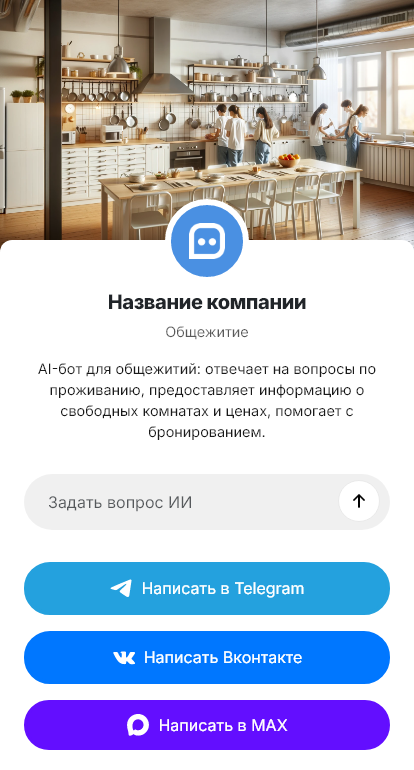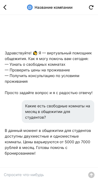 Внедрение настраивается под конкретное общежитие: типы комнат, цены и тарифы, правила и ограничения, условия залога, регистрация, интеграция с CRM или журналом заселений. Бот помогает назначить время заезда, выдать инструкции, как добраться, и напомнить, что нужно взять с собой.