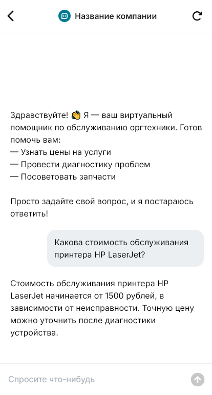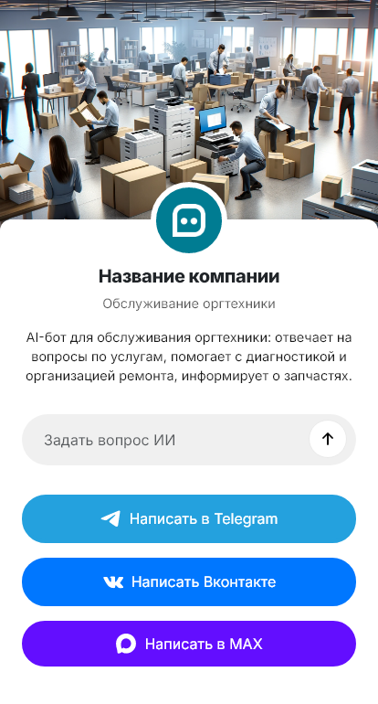 Обслуживание оргтехники работает без простоев, когда бот принимает заявки и сразу уточняет парк устройств