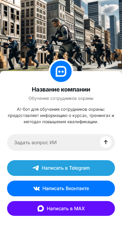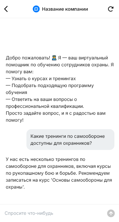 Бот для обучения охраны помогает быстро квалифицировать запрос и собрать данные. Он уточняет, кого нужно обучить: количество сотрудников, уровень подготовки, требуемый разряд/программа, регион, сроки и формат обучения, необходимость периодической проверки знаний, медицинские документы, а также контакты ответственного лица. Бот может предложить варианты: обучение в группе, корпоративный формат, дистанционная теория (если применимо) и практические занятия.
