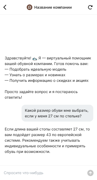 В итоге обувная компания получает больше продаж и меньше возвратов из за ошибок в размере, а клиент получает уверенность и удобный сервис в одном канале благодаря боту.