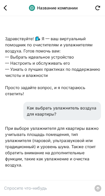 Бот для продажи очистителей и увлажнителей помогает подобрать устройство под условия. Он уточняет площадь, количество комнат, есть ли аллергики или дети, текущие проблемы (сухой воздух, пыль, запахи), желаемый режим работы, требования к шуму и бюджету. Бот может объяснить разницу технологий, подсказать по сменным фильтрам и обслуживанию, а также предложить подходящие модели.