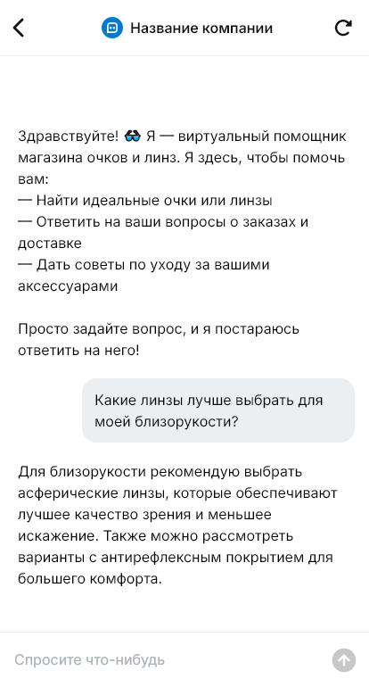Очки и контактные линзы покупают не импульсивно: человеку важно понять, что ему подойдёт по зрению, комфорту и образу жизни. Покупатели пишут в мессенджер с разными вопросами — «как выбрать линзы», «подойдут ли эти очки по рецепту», «какие покрытия лучше», «можно ли сделать быстро». При этом часть клиентов стесняется спрашивать, путается в параметрах (диоптрии, цилиндр, ось, межзрачковое расстояние), и если консультант отвечает долго, человек уходит к конкуренту или делает покупку наугад.