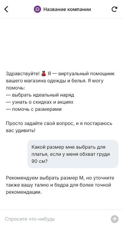 Чат-бот помогает подобрать размер, уточняет предпочтения, рассказывает о моделях и условиях покупки. Он работает круглосуточно, поддерживая клиентов даже вне рабочего времени магазина.