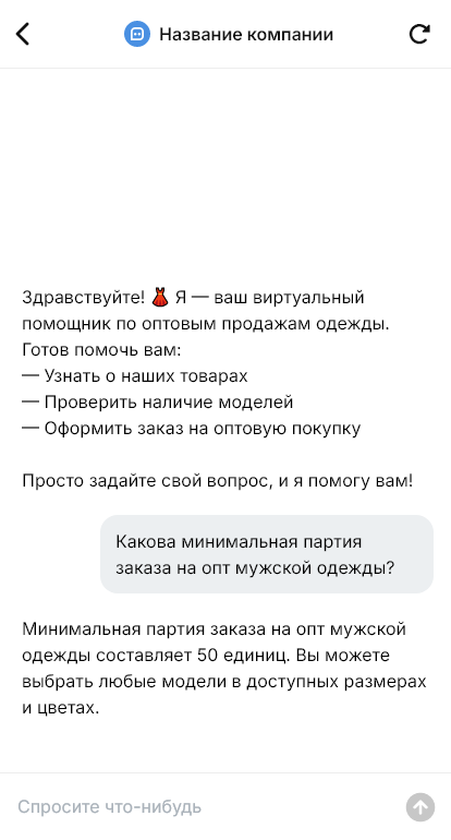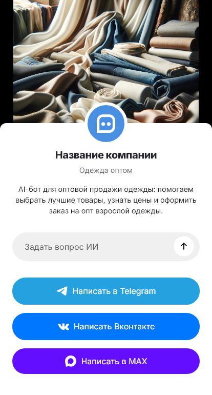Одежду оптом закупают магазины, шоурумы и маркетплейсы. Клиенты спрашивают каталоги, размерные ряды, минимальные партии, сроки, условия доставки и возвратов. Если ответить медленно, закупщик уходит. Бот для одежды оптом помогает автоматизировать первичный контакт и собрать вводные для КП.