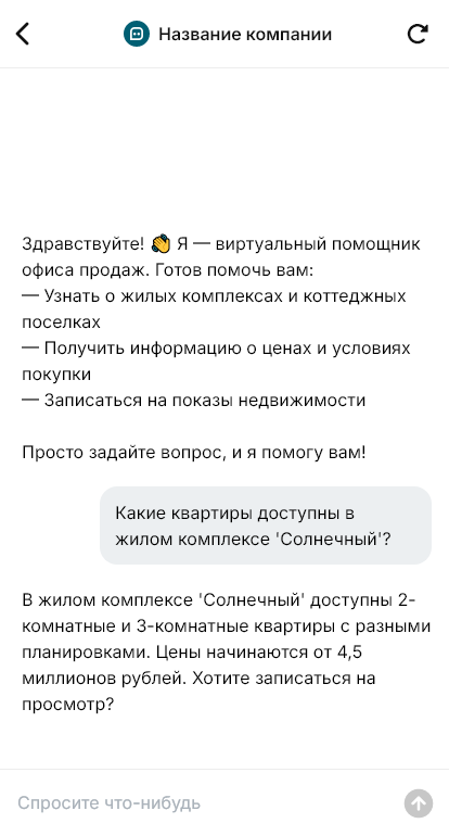 Офис продаж часто принимает поток обращений из рекламы и с сайта. Люди спрашивают про цены, планировки, наличие квартир, условия покупки, ипотеку, скидки, документы, сроки сдачи. Если менеджер отвечает вручную, часть лидов не доживает до визита, а те, кто приходит, часто не подготовлены и тратят встречу на базовые вопросы. В результате снижается эффективность офиса и растут расходы на привлечение.