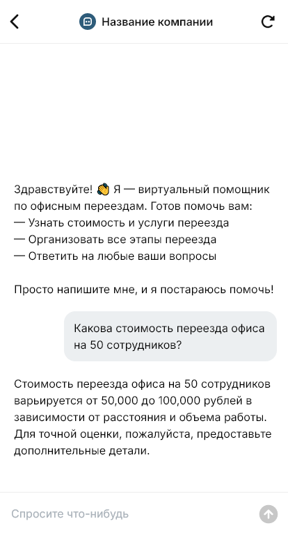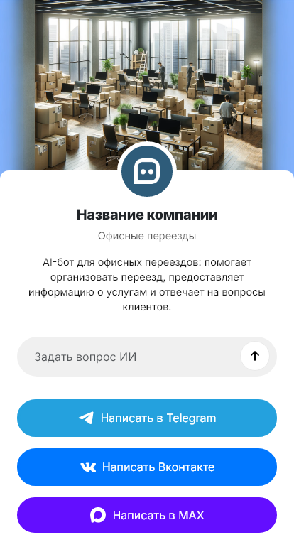 Внедрение настраивается под вашу компанию: тарифы, состав услуг, график бригад и транспорта, интеграция с CRM и календарём. Бот может предлагать форматы: «ночной переезд», «переезд за выходные», «поэтапный переезд отделов», а также отправлять чек-листы подготовки офиса: как упаковать документы, что подписать, как организовать доступ в новые помещения.