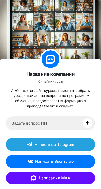 Чат-бот помогает выбрать направление, уточняет цели и уровень, показывает программы, расписание и цены, объясняет формат обучения, собирает контакты и передаёт заявку менеджеру или направляет на оформление. Бот работает в Telegram, VK, MAX и на сайте, обеспечивая поддержку 24/7.
