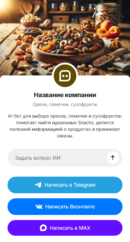 В итоге орехи и сухофрукты продаются стабильнее, потому что выбор становится простым и понятным. Бот работает в Telegram, VK, MAX и на сайте, превращая вопросы о свежести и составе в оформленные покупки.