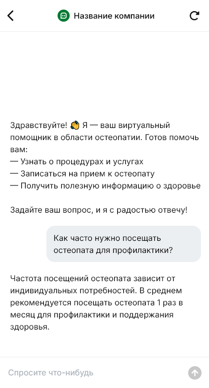 В остеопатии большинство обращений начинается с простого запроса на удобное время. Люди уточняют длительность приёма, свободные окна, адрес, стоимость, как перенести визит и что нужно знать перед первой консультацией. Если администратор отвечает с задержкой, часть клиентов теряется, особенно вечером и в выходные, когда чаще всего и пишут. При активной рекламе или рекомендациях переписка быстро перегружает персонал.