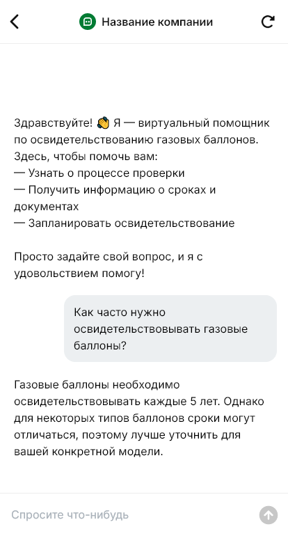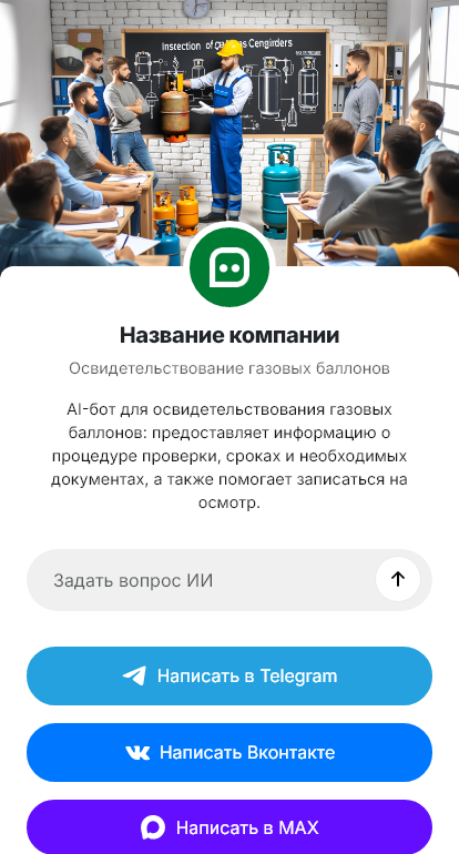 Бот помогает организовать запись и подготовку. Он уточняет тип баллона, объём, назначение, последнюю дату освидетельствования, наличие паспорта и маркировки, и предлагает ближайшие слоты. Бот отправляет чек лист подготовки и требований по безопасности, чтобы снизить риск отказа в приёме. Он фиксирует контакт, оформляет заявку и отправляет подтверждение с адресом, временем и правилами посещения.