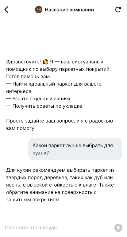 В итоге клиент быстрее принимает решение и получает паркет, который подходит под реальные условия, а продавец повышает доверие и снижает количество претензий благодаря понятной консультации через бота.
